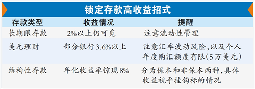 三是部分具有一定风险承受能力的投资者,可考虑投资结构性存款产品。记者查询多家银行的结构性存款产品信息,发现挂钩不同标的的保本型结构性存款最低年化收益率范围在0%~2.7%,最高年化收益率可以达到3.5%~6%;而非保本型结构性存款的最高年化收益率可以达到8%。有理财经理提醒,非保本型的产品有可能承担本金损失。
