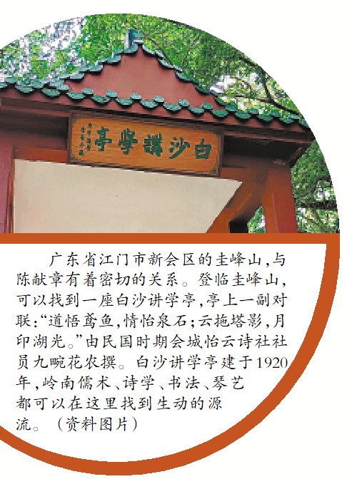 陈献章虽做过官但仅为虚衔,且时间很短,他一生大部分时间都是在讲学中度过的。其主要讲学场所有小庐山书屋、碧玉楼、江门钓台、嘉会楼等。其中位于今天江门市白沙公园的嘉会楼“地凡若干亩,楼凡三楹,高若干丈,广如之……山环水绕,足称名胜”,规模大,环境优美,是白沙讲学之所中最大、最好的一处,“当事为韧嘉会楼,及门宾友相与讲论不倦”。