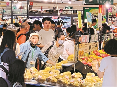 记者走访看到,各大商场周末热闹非凡。天河城的永旺超市里,几乎每条通道都挤满了人。街坊们推着购物车穿梭在各种货品之间,很快就把购物车装满了。