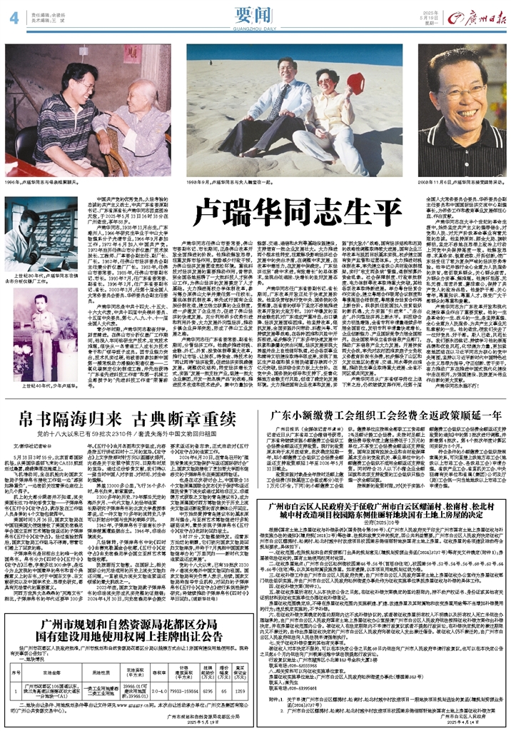 中国共产党的优秀党员,久经考验的忠诚的共产主义战士,中共广东省委原副书记、广东省原省长卢瑞华同志因病医治无效,于2025年5月13日16时18分在广州逝世,享年88岁。
