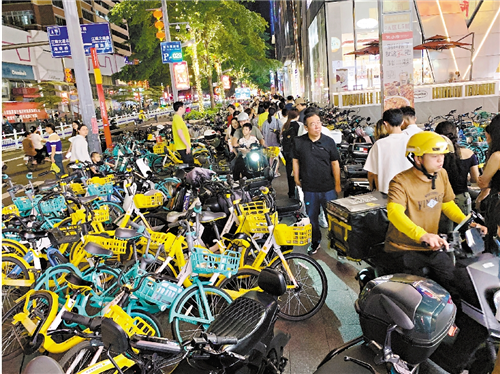 记者在江南西地铁站B出口看到,人行道确实停满了电动自行车和共享自行车,密密麻麻“塞满”了人行道,只剩下一条窄缝可供路人通行。部分共享自行车由于摆放混乱,甚至整排倾倒。在这一区域,有摊贩占道摆卖,进一步导致了环境恶化。在这么狭窄的人行道上,甚至有电动自行车肆意穿行,有居民反映,有行人被电动自行车碰撞受伤。