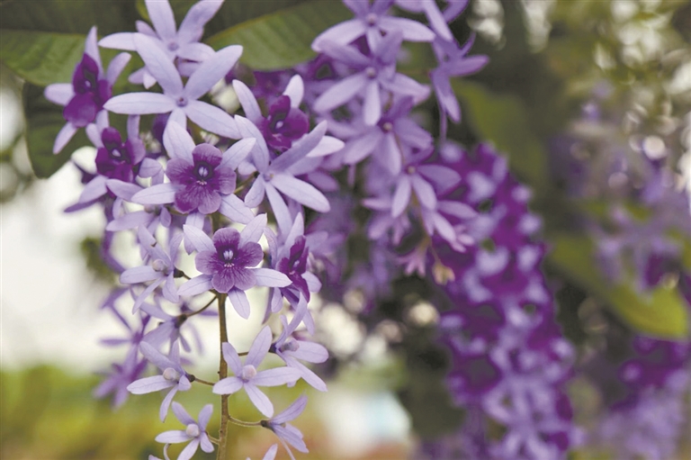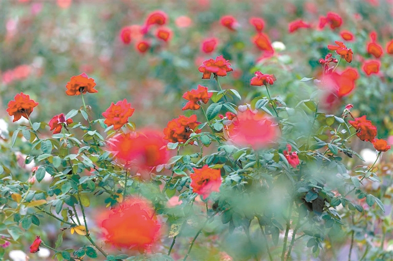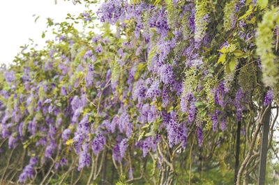 走进园区,首先映入眼帘的是正在盛开的大片蓝花藤。紫蓝色的花穗如梦似幻,从长廊上一泻而下,宛若一帘帘轻柔的花瀑,令人仿佛置身于童话世界。在不远处的玫瑰园中,18000株各色大花玫瑰迎风绽放,热烈的红、温柔的粉、典雅的白……宛如仙子在阳光下翩翩起舞。