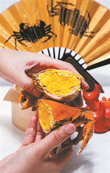 黄油蟹最经典的吃法便是清蒸。烹饪时,需以冰水麻痹活蟹,防止挣扎致油流失,清蒸时火候精准拿捏。海珠赤岗街道艺泓路上的熹鳌会黄油蟹体验店里,主理人可可用冰水将黄油蟹冻晕后,在奄位夹上姜片和柠檬叶清蒸,淡淡的柠檬清香和海洋咸鲜味完美混搭,油膏金黄甘香,齿颊留香。