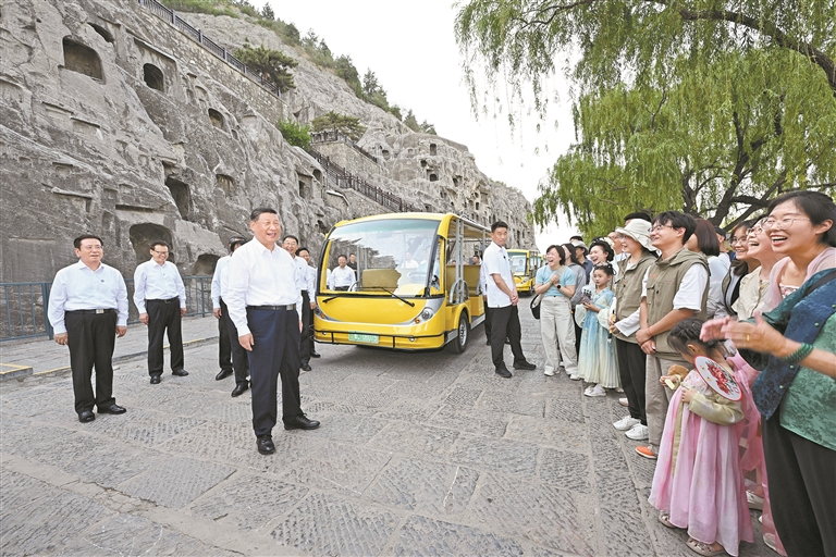 已有1500多年历史的龙门石窟,是重要的世界文化遗产。习近平来到这里,察看石窟整体布局风貌和代表性窟龛、造像,同现场的文物保护工作者亲切交流。他强调,要把这些中华文化瑰宝保护好、传承好、传播好。游客们见到总书记,都十分欣喜,纷纷向总书记问好。习近平不时同大家交流,特别鼓励小朋友们多到实地寻溯中华文化,从小树立文化自信。他指出,文旅融合前景广阔,要推动文旅产业高质量发展,真正打造成为支柱产业、民生产业、幸福产业。