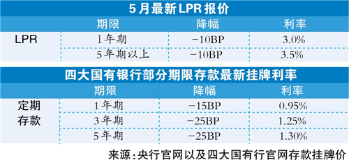 广州日报讯 (文/表 全媒体记者 林晓丽、王楚涵)今年首轮存款和贷款降息,同时落地。5月20日一早,工农中建交及邮储等六大国有银行,以及招商银行、光大银行纷纷下调存款利率。其中,3年期和5年期存款下调幅度最大,达到25个基点,而1年期定存利率已全面跌至1%以下。随后公布的5月LPR报价,1年期LPR和5年期以上LPR分别下调10个基点,降至3%、3.5%。