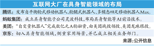 除了腾讯,蚂蚁、美团、京东等互联网大厂,今年以来也陆续被曝光与具身智能相关的投资等动作。其中,5月12日,具身智能公司“自变量机器人”完成数亿元A轮融资,由美团战投领投、美团龙珠跟投。公开信息显示,“自变量机器人”成立于2023年12月,聚焦“通用具身大模型”的研发。今年3月,蚂蚁集团旗下的具身智能子公司灵波科技揭牌。同样是3月,消息称京东已切入具身智能领域,侧重家用场景,并已成立相关业务部门。