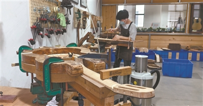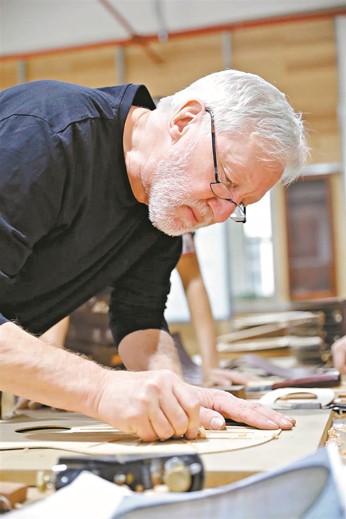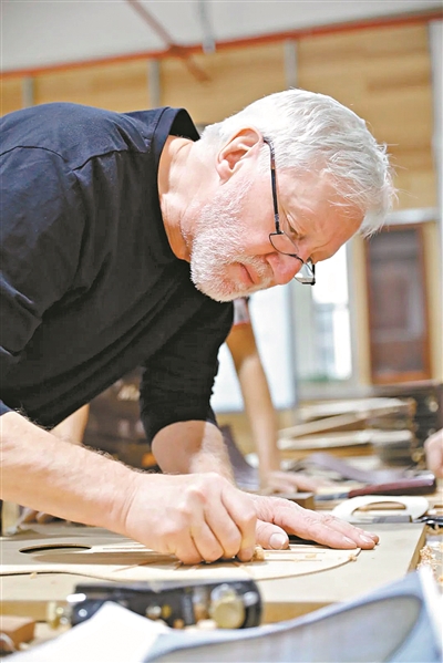 一名正伏在工作台前用小刀细心刮削一片片木制小方格的女工匠吸引了记者的目光,随着手腕有节奏地摆动,每一道刮削都让细小的木制构件更加光滑,打磨的痕迹都与木纹走向完美契合。“这些木格子我们叫音梁,决定吉他音色的动态范围与延音,虽然是安放在吉他内部,外表看不见,但制作工艺依然不能马虎,稍微有些毛刺和变形,音色就会失去灵性。”