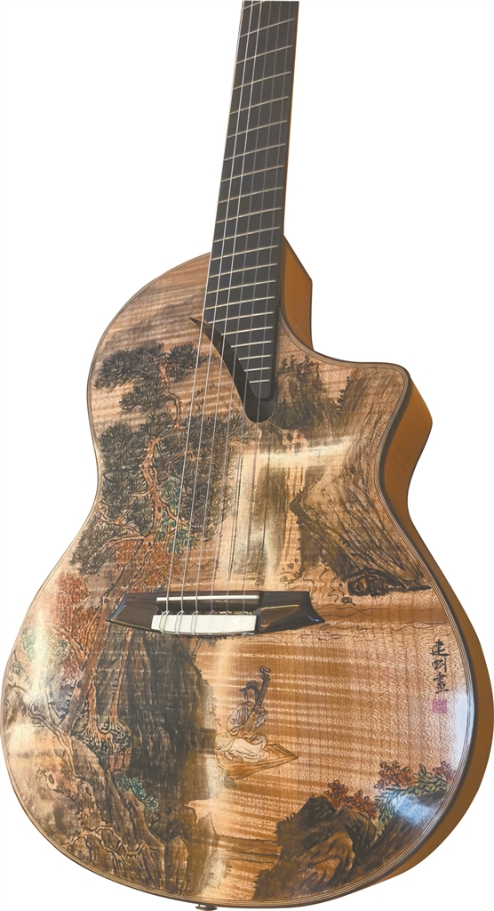 在一排排的多宝阁里,古典的、民谣的以及玛丁尼Godoy系列手工吉他等高端产品令人目不暇接,其中,一把泛着高雅光泽、遍绘山水人物漆画的古典吉他格外引人注目,工匠以背板的老松云杉木为画板,运用法式宫廷亮漆绘以中国传统的高山流水和仕女抚琴的题材,恍若千年古风与现代漆艺的跨时空和鸣,令人爱不释手,更有琴颈镶嵌着精美的螺钿贝壳等装饰,仿佛每把吉他都是凝固的时空胶囊:敦煌的飞天托举着东方美学,凡尔赛的鎏金承载着欧洲典雅,而车间的数控铣刀与手工凿痕,正将所有的文化基因重新编码,让琴弦震颤的不仅是音符,更是人类对美的永恒叩问。