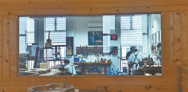 在工坊里,一排排的吉他半成品像整装待发的士兵,等候着工匠们的检阅。参观者可以近距离目睹难得一见的吉他制作工序细节。据悉,基地开放式的设计也是为了方便游客来此见证木材蜕变为艺术品的全过程,又被称为DIY制琴工坊,每天都有吉他艺术爱好者来此亲手打造专属吉他,留存独特音乐记忆。