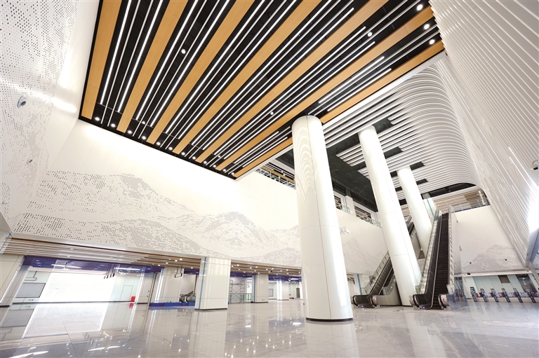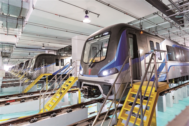 十号线列车采用6节编组B型车,设计最高时速80公里,车辆长约120米,宽2.8米,高3.8米,载客量可达2000余人。车辆外观以灰色为底色,灰蓝色与蓝色色带贯穿车身,简洁大气;车厢内采用简约现代风格,配置大尺寸动态地图及端部显示屏、亚克力带、环形灯等设计,营造温馨明亮的乘车环境。同时,车辆应用智能运维系统,可实现列车全寿命周期智能运维;采用永磁牵引系统,运用综合节能控制技术,使整车能耗指标下降15%以上;配置轻量化高频辅逆系统,使每列车减重超过600公斤,降低了运行能耗。
