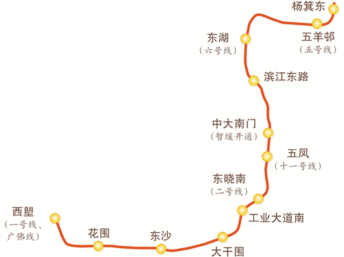 十号线(西塱至杨箕东)将率先开通运营,全长17.2公里,设置12座车站(其中,中大南门站暂缓开通),换乘站有5座,分别是西塱(一号线、广佛线)、东晓南(二号线)、五羊邨(五号线)、东湖(六号线)、五凤(十一号线)。线路开通后,将填补滨江东路区域轨道交通空白,进一步加密中心城区轨道交通网络。十二号线先开通浔峰岗至广州体育馆段、二沙岛至大学城南段。