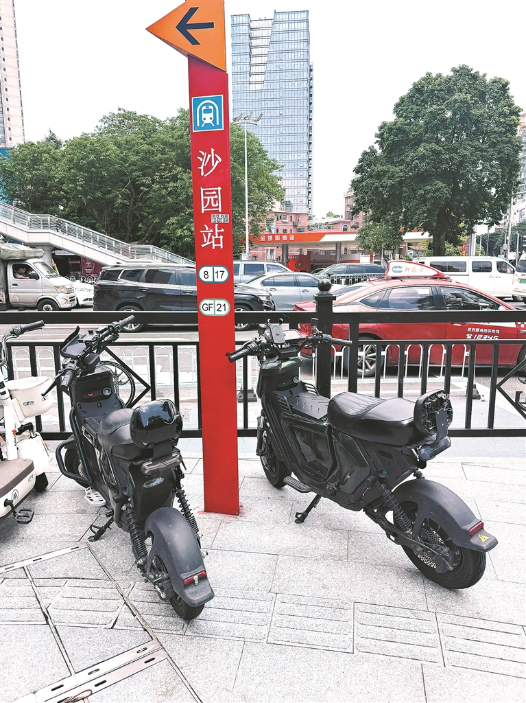 前日,记者走访沙园地铁站、体育中心南地铁站周边看到,停放的电动自行车中部分车辆未悬挂本市号牌,部分车辆存在“花式”遮挡号牌行为。以地铁体育中心南站附近为例,在天河城对面的一处空地上,停放的20余辆电动自行车中有8辆是无牌“电鸡”。