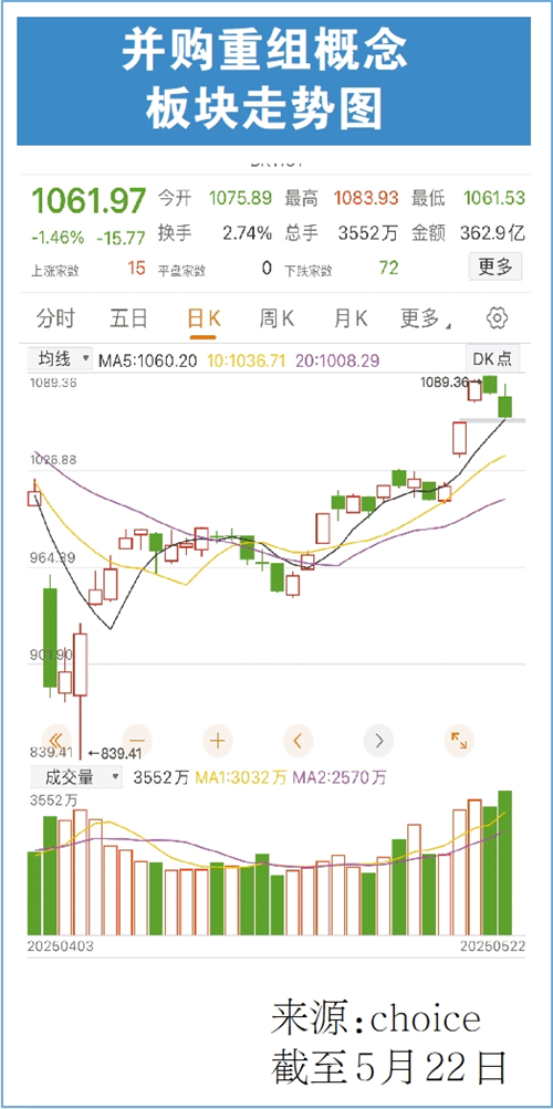 二级市场方面,并购重组概念股受到资金追捧,走势强劲,截至5月22日收盘,本周并购重组板块上涨幅度为4.4%。