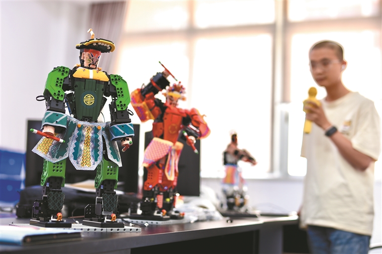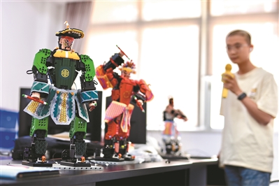 采访期间,陈锐烽还带领其研发团队成员,向记者展示了与升级版英歌舞机器人的互动场景。只见两只正在进行最后调试的积木机甲机器人英歌舞队员,手持英歌槌“呆萌”地站立着,当研发员通过语音向其发出“下蹲”“跳一段英歌舞”等指令时,他们立刻活灵活现地按照指令完成动作,并且可以不时转换舞姿。