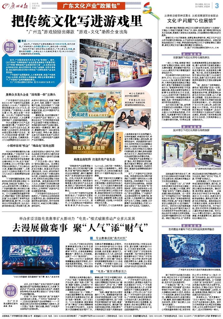 - 把传统文化写进游戏里 网络游戏 近日,广东重磅发布六大文化产业“政策包”。其中,《关于推动广东网络游戏产业高质量发展的若干政策措施》(以下简称“网络游戏产业政策措施13条”),从支持原创精品和科技创新、优化营商