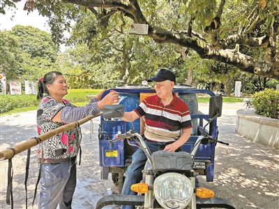 清晨,古荔公园荔枝林蝉鸣阵阵,随处可见高大茂盛的荔枝树,刘多敬戴着斗笠穿梭树间,动作利落地剪除病枝。邝灿林紧跟其后,将妻子剪下的枝条捆扎成堆。“她眼神好,能发现我瞧不见的虫害;我力气大,负责扛肥料。”邝灿林说,两人分工如同荔枝的“甜”与“鲜”,缺一不可。