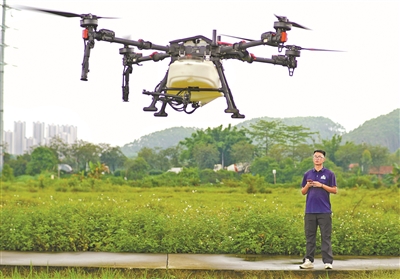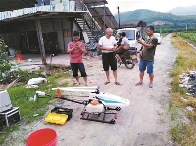 5月农忙季的一天,在一处无人机维修车间内,广州市兴农农业服务有限公司技术经理、广州市永昇农机专业合作社社长刘广镇掏出手机,向记者展示了一张特别的照片:几名农户正拿着手机,对着一台白色单旋翼植保无人机拍照——这是2017年,他创业时接触到的第一台农用无人机。当时,他来到增城投身农用无人机赛道创业,成为广州第一批农业无人机的飞手。