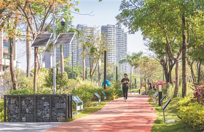 比如云城西路带状公园,面积虽然不算太大,但是园内设置了15分钟健身亲子圈,布置了11处文化展示点,如吴隐之的故事、洪拳等,让儿童在游玩中了解到白云文化。公园内建设的海绵城市科普驿站配备了科普展厅、智能互动屏、太阳能绿色屋顶,结合海绵雨水回用装置,让驿站屋面雨水经过海绵净化过滤展示池,流入户外雨水花园渗透回用,并用可视的方式展示给儿童,通过生动直观的回收实例,结合AI智能科普展示牌,让公众了解海绵城市的知识。