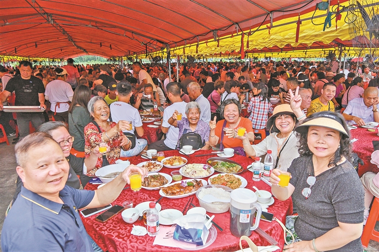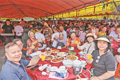“上菜!”当日,蚌湖保安和华侨会所及蚌湖片区多条村共筵开超过1300桌龙船饭。其中约300桌专门招待鸦岗乡亲、龙舟队队员及各方嘉宾。“红皮赤壮”(脆皮烧肉)“兴高采烈”(辣椒头菜炒花肉)“年年有余”(清蒸多宝鱼)“力争上游”(烧鹅)“展翅高飞”(姜葱白切鸡)……八菜一汤组成天长地久,宾客们大赞“好味”。