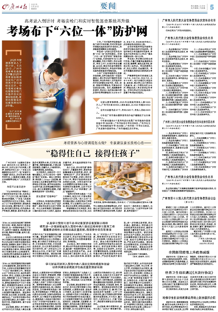 - 考场布下“六位一体”防护网 2025年普通高考进入了倒计时。5月28日,广州市高考考前准备工作暨2025年高考局际联席会议在广州市培英中学云城校区召开。今年高考对考场的智能安检门进行升级并优化完善安检流程,考场的智能实时巡