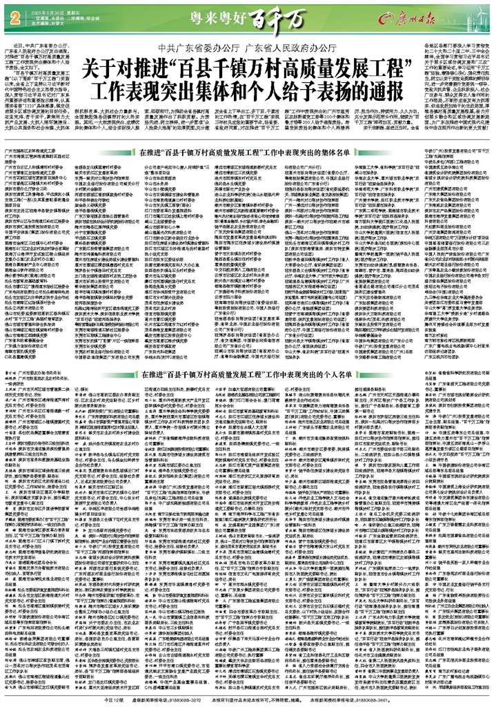 近日,中共广东省委办公厅、广东省人民政府办公厅发出通报,对推进“百县千镇万村高质量发展工程”工作表现突出集体和个人给予表扬,全文如下。