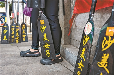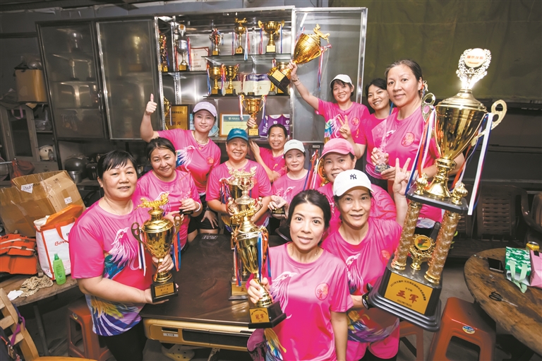 这些年,沙美女队在全国多座城市参加了各级龙舟赛。在龙舟基地,一个靠墙的玻璃柜里,放满了奖杯。梁艳霜说:“这些全是我们比赛获得的。”当然,对这支女子队来说,名次、奖杯或许不是最重要的,最重要的是掌声背后的认可,是那一句“你看,这群女子也可以扒龙舟,而且扒得很专业!”
