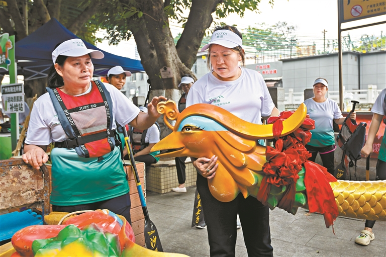 后来,村里青年龙舟队队员帮忙指导女队训练。经指点,女队员发现,原来扒龙舟时双手与桡要形成一个固定的三角形“框架”,发挥腰部力量下桡,要带着力量将桡插入水,下得要深。“扒法正确的话是不会弄湿衣服的。”一位队员说。