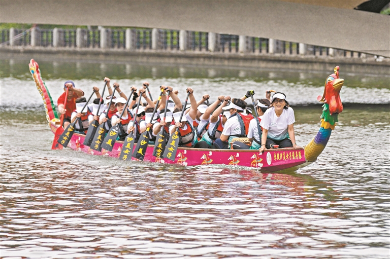 一旦上了龙舟,笑脸会突然收住,神情转为专注。执桡、下腰、插桡、起桡……每个动作都迸发着刚劲的力量,伴随着整齐划一的口号声,龙舟逆水前行,仿佛要在水面上掀起一场“惊涛骇浪”。