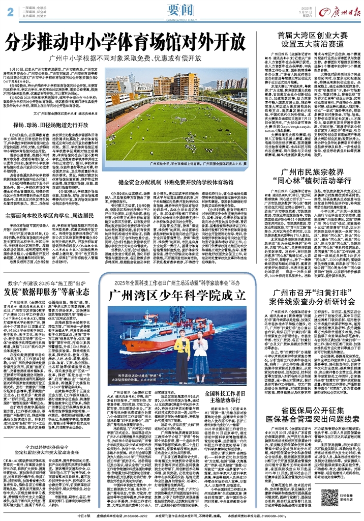 - 分步推动中小学体育场馆对外开放 5月30日,记者从广州市教育局获悉,广州市教育局、广州市发展和改革委员会、广州市公安局、广州市财政局、广州市体育局等部门近日联合印发《广州市中小学校体育场馆向社会开放实施办法》(以下简称《办法》)