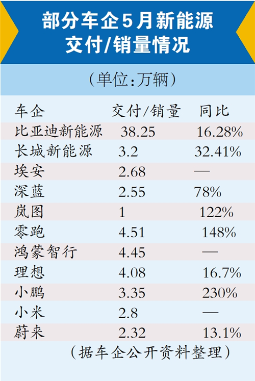 广州日报讯 (文/表 全媒体记者邓莉)近日,多家新能源车企公布5月销量数据,其中新势力车企交付量集体大涨,竞争呈现“你追我赶”的激烈趋势。业内指出,5月销量的普遍大涨,显示在以旧换新等政策下,我国汽车行业保持较强活力,消费信心迅速回升。中国汽车流通协会综合政策红利释放与终端促销节奏,预计5月份全月乘用车终端销量在185万辆左右,同比增长8.5%,环比增长5.4%。其中,新能源乘用车零售约98万辆,渗透率约52.9%。