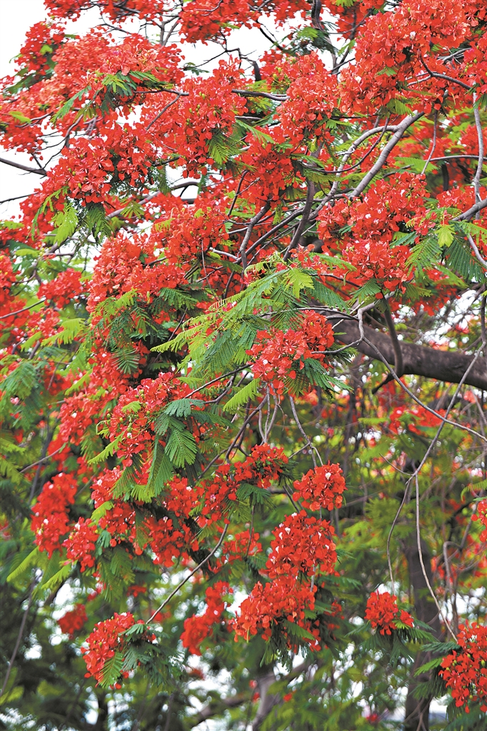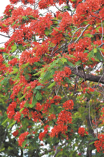 凤凰木,叶如飞凰之羽,花若丹凤之冠。 图:广州日报全媒体记者 杨耀烨