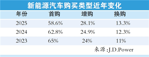 J.D.Power调研数据显示,中国新能源汽车首购用户占比连续三年下滑,2025年至今更首次下降至低于六成,占比为58.6%;换购用户则增至13.3%,增购用户同比增速最快达到28.1%。此外,中国家庭两辆及以上车辆占比上升至31.3%,这些数据均显示出新能源汽车市场正由增量向存量过渡。