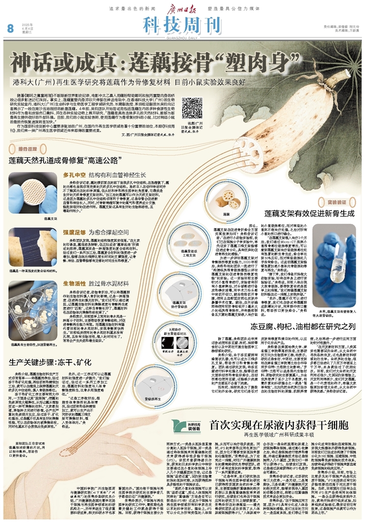 随着《哪吒之魔童闹海》不断刷新世界影史纪录,电影中太乙真人用藕粉帮助哪吒和敖丙重塑肉身的桥段让很多影迷记忆深刻。事实上,莲藕重塑肉身并非只停留在神话传说中,在香港科技大学(广州)的生物研究实验室内,港科大(广州)生命科学与生物医学工程学域研究员、长聘副教授、系统枢纽副院长吴钧向记者展示了一段在南沙当地刚挖的新垦莲藕。4年前,吴钧团队开始尝试用包括莲藕在内的多种食源性生物材料作为骨和皮肤伤口敷料,并在各种实验动物上展开研究,“莲藕是具有连续多孔的天然材料,能够为断骨再生提供很好的外部环境。目前,我们的小鼠实验表明,使用莲藕作为骨修复材料的小鼠,比对照组小鼠的骨损伤恢复速度明显加快。”