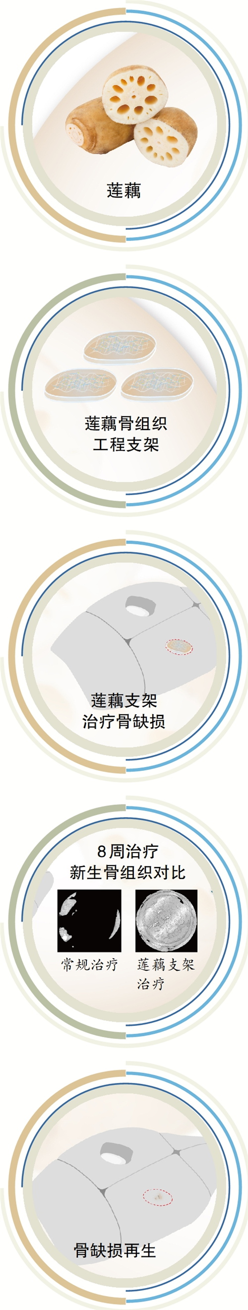 “此外,莲藕不仅可以进行骨修复,我们也在尝试将莲藕制成极薄的片状,用来制作伤口敷料,帮助伤口更快愈合。”吴钧说。