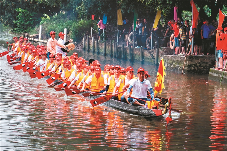 在江门,龙舟竞渡有着深厚的历史底蕴,早已成为乡村文化的重要符号。今年,各地龙舟赛事如火如荼。新会大泽镇举办的广东省第七届传统龙舟争霸赛,15支队伍在牛勒河上展开激烈角逐,现场3万多人热情助威,还有超1800万人次通过直播观赛。