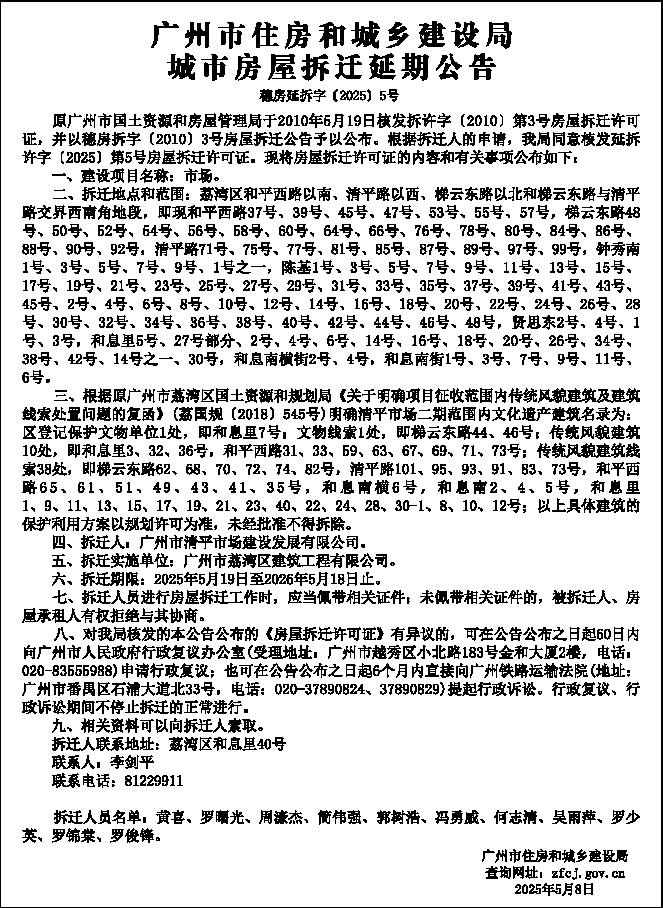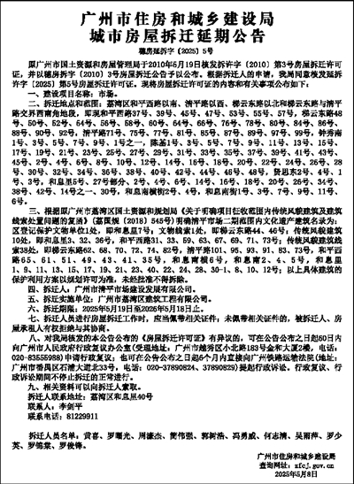 广州市住房和城乡建设局城市房屋拆迁延期公告