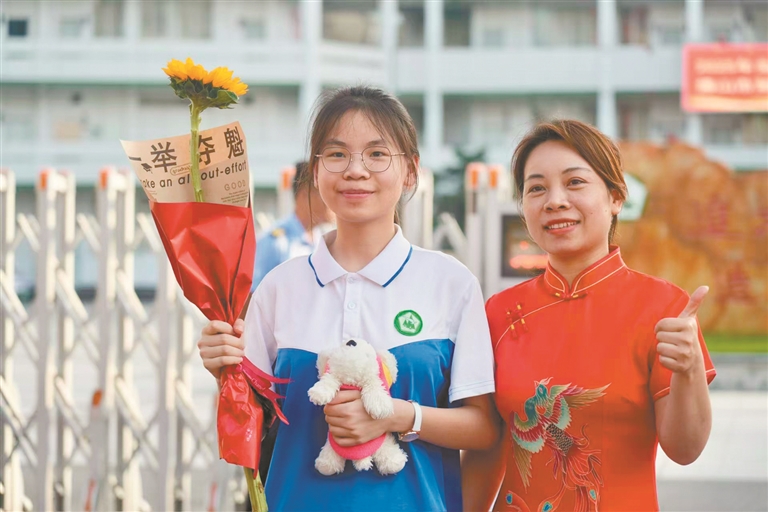 在佛山市顺德区华侨中学考点,该校高三生物老师郭慧敏、高三数学老师孙军杰有着“双重牵挂”,今年高考,她们不仅是高考核心备课教师,还是高三娃的妈妈。开考第一日,连同自己所带的学生,她们还将在同一所高中就读的孩子一起送入了高考考场。