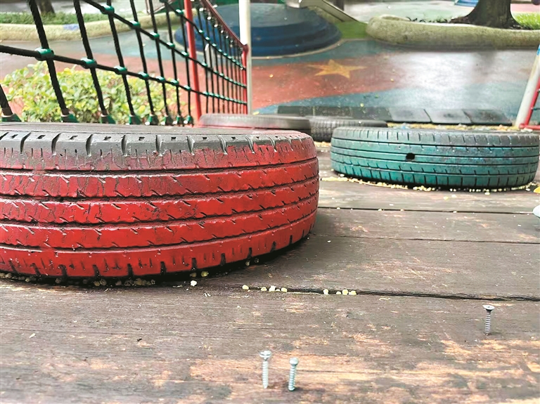 在番禺儿童公园,一组儿童秋千的拉扣已经脱落;在天河儿童公园,儿童攀岩区域有几根铁钉凸起在塑料板上,容易引起刮伤。