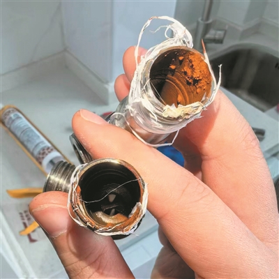 住户南先生把家中水龙头的角阀拆了下来泡在盆子里,水很快就变黄了。记者注意到,泡在水盆中的角阀锈迹斑斑,盆底有很多沉淀物。