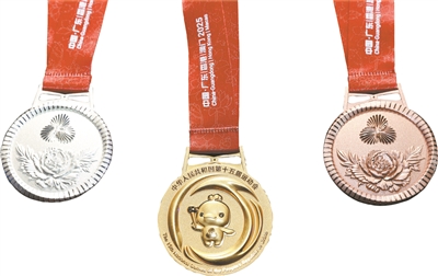 群体项目的奖牌上有毛主席的题词“发展体育运动 增强人民体质”,体现中华民族对强身健体、增强体魄的体育精神追求。