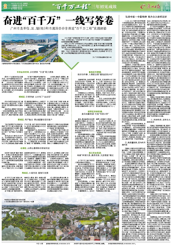 - 奋进“百千万” 一线写答卷 2025年是广东推进实施“百千万工程”,实现“三年初见成效”目标的重要节点。大市挑大梁,广州如何将“百千万工程”作为“再造新广州”的重要抓手,纵深拓展高质量发展道路? 昨日,2025年广州