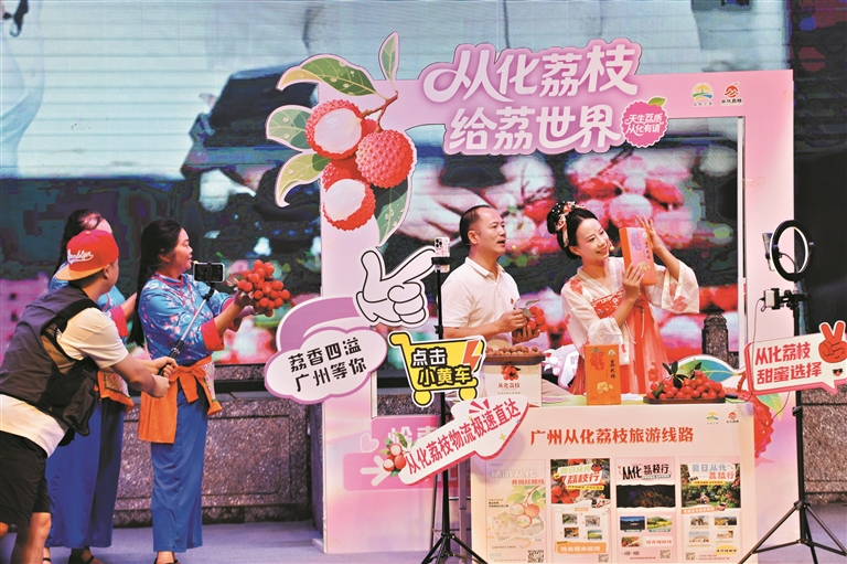 从化区以快闪节目推介荔枝。节目汇聚近百名村党支部书记、百名大学生、荔农、网红及百家荔企代表,以“科技+文旅+直播”模式,呈现荔枝从枝头到舌尖的全过程。