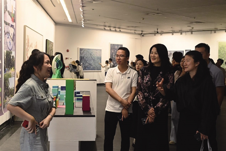 现场展出的毕业作品相较常规美术院校创作,并非聚焦学生自我审美表达,而是深度扎根当地乡情乡风。展区内特别设置工作营互动展墙,完整呈现从镇域航拍测绘、村民需求座谈到设计手稿推敲的全流程记录。泰美镇负责人观展时感触颇深:“这些作品精准呈现了我们镇村的特色风貌与物产资源,比如将东江水波纹抽象为视觉母题,把当地特产转化为导视牌造型语言,真切感受到广美师生与科技特派员团队的倾力投入。这些兼具实用性与美学价值的村标系统、视觉设计和公共装置,将落地于村口、绿道、乡间……我们切实体会到科技助农带来的乡村蝶变:村民居住环境优化、公共空间升级、增收渠道拓宽,农民对家乡认同感增强,城市居民也更愿意赴乡村度假消费。”