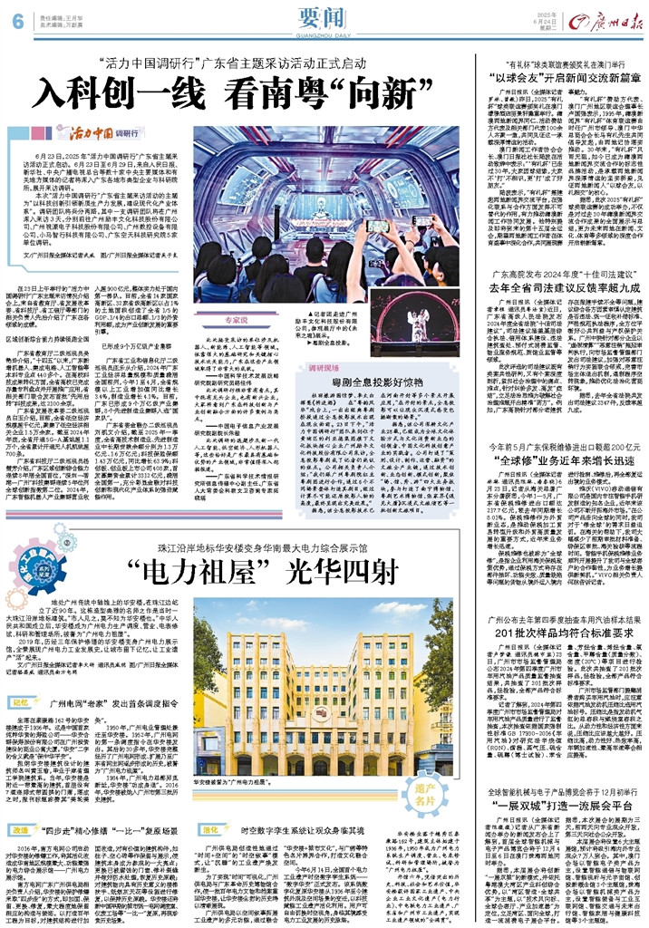 - 入科创一线 看南粤“向新” 活力中国调研行 6月23日,2025年“活力中国调研行”广东省主题采访活动正式启动。6月23日至6月29日,来自人民日报、新华社、中央广播电视总台等数十家中央主要媒体和有关地方媒体的记者将深入
