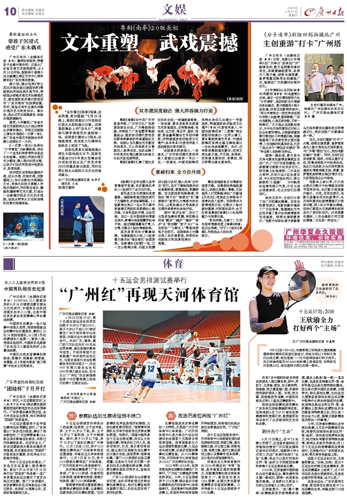 - “广州红”再现天河体育馆 广州日报全媒体记者 杨敏 6月25日至29日,第十五届全国运动会排球项目男子20岁以下组(U20)、男子18岁以下组(U18)测试赛在广州天河体育中心体育馆、华南农业大学体育馆举行。来自广东、