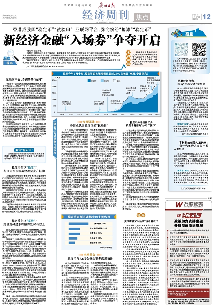 - 新经济金融“入场券”争夺开启 深度观察 “稳定币”横空出世。 全球多个国家和地区正努力推进这一新型数字货币的合法化,中国香港特别行政区立法会通过《稳定币条例草案》;京东、蚂蚁等巨头纷纷出手“抢滩”;以国泰君安国际