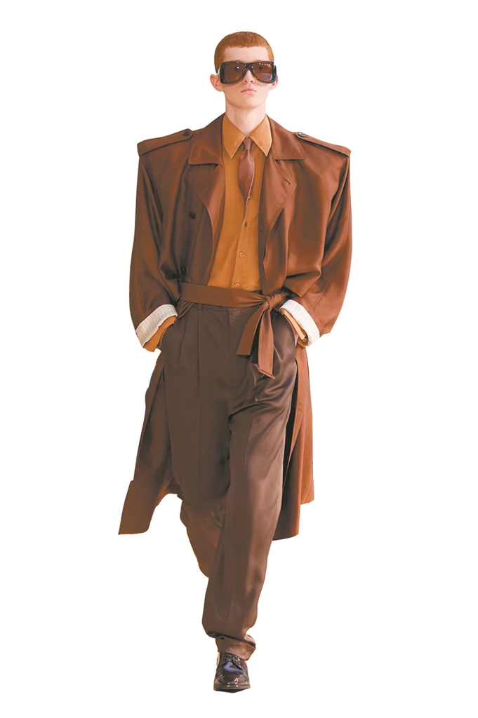 在Saint Laurent秀场上,延续品牌秋季女装系列中迷人的赭石色与卡其色,男装系列也融入更多富有季节氛围的色调,如高贵典雅的金色、浓郁厚重的森林绿以及热烈醇厚的波尔多红,整体更具有层次感。