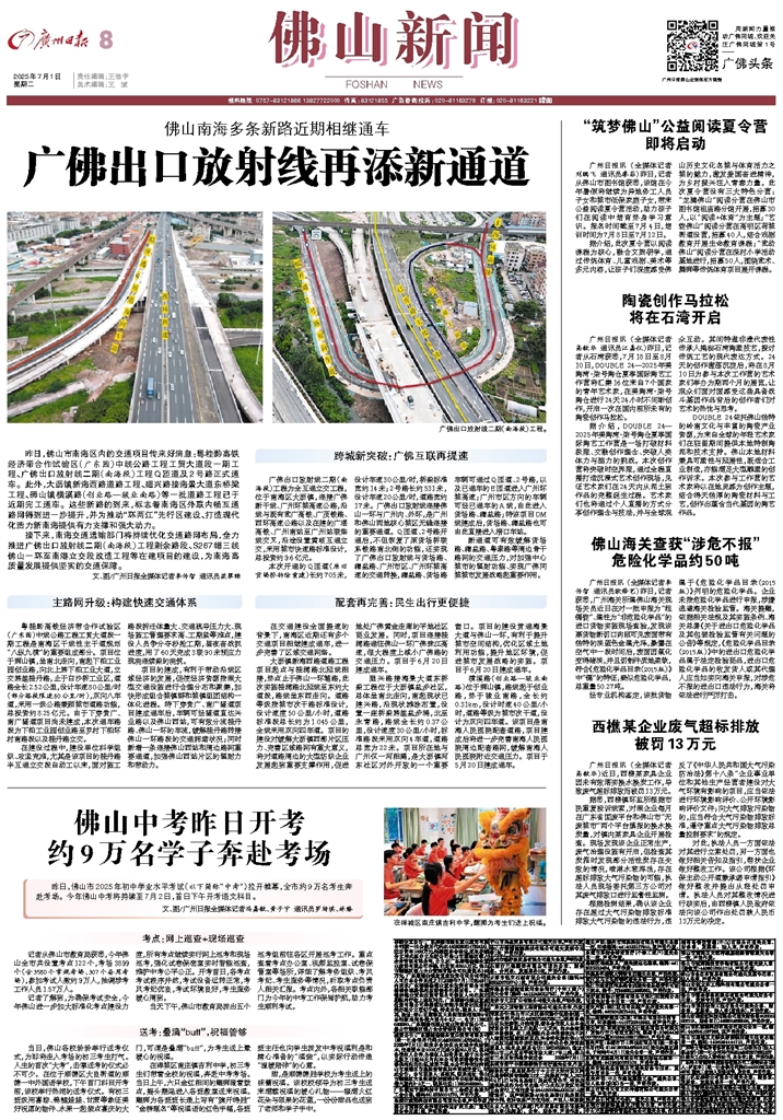 - 广佛出口放射线再添新通道 昨日,佛山市南海区内的交通项目传来好消息:粤桂黔高铁经济带合作试验区(广东园)中线公路工程工贸大道段一期工程、广佛出口放射线二期(南海段)工程Q匝道及2号路正式通车。此外,大沥镇新海西路道路工程、