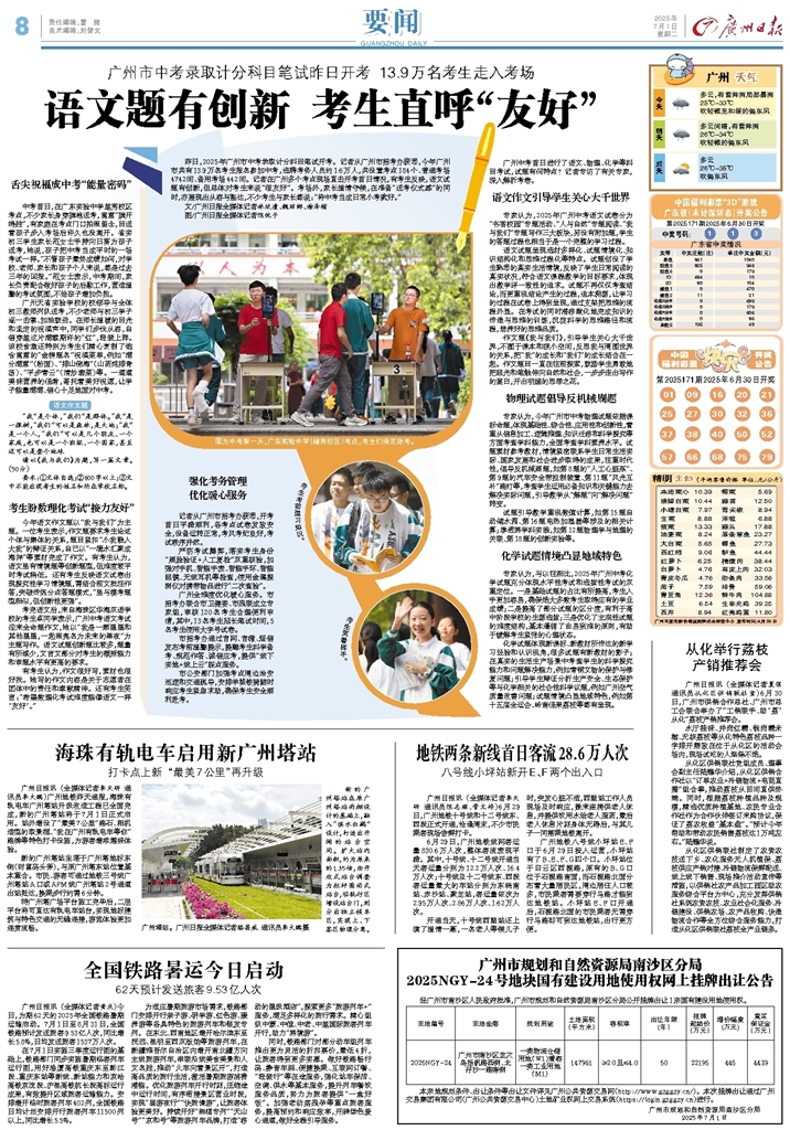 - 语文题有创新 考生直呼“友好” 昨日,2025年广州市中考录取计分科目笔试开考。记者从广州市招考办获悉,今年广州市共有13.9万名考生报名参加中考,选聘考务人员约1.6万人,共设置考点184个、普通考场4742间、备用考场442