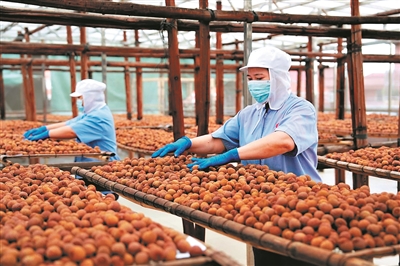 在鑫源食品的天然晒场,成批的新鲜荔枝正在接受阳光的洗礼——制成荔枝干。据了解,其荔枝干全程采用生晒工艺,无任何添加。鲜果于清晨采摘后,经过清洗、沥干、剪枝、挑拣等工序,置于工厂天台的天然生晒棚中。晴天条件下,鲜荔枝晒制8—12天后即可收成。约4斤荔枝鲜果可制成1斤荔枝干,保质期长达2年。鑫源食品销售副总经理王乐强介绍:“今年预计收购100吨鲜果,可晒制约25吨荔枝干,远超去年产量。”